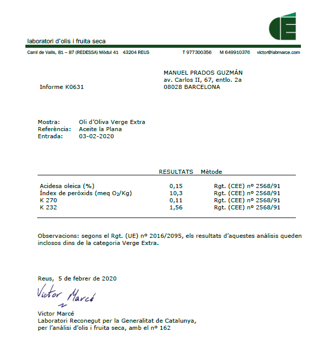 En Casa La Plana enviamos cada año nuestras muestras de aceite de oliva virgen extra (AOVE) al "Panell de Tast Oficial d’Olis Verges d’Oliva del Departament d’Agricultura de la Generalitat de Catalunya" para realizar una cata oficial que evalúa sus características organolépticas , aroma, sabor y calidad global. Además, efectuamos rigurosos análisis en laboratorio para el control de calidad del aceite de oliva , en los que se evalúan parámetros físico-químicos como el grado de acidez, estabilidad y otros atributos fundamentales para garantizar un producto de alta calidad. Los informes oficiales de la cosecha 2026 confirman que nuestro aceite LA PLANA presenta una calidad excelente , cumpliendo con todos los requisitos para ser considerado Aceite de Oliva Virgen Extra (AOVE) . Este reconocimiento certifica que hemos alcanzado los más altos estándares de calidad en sabor, aroma y propiedades organolépticas.