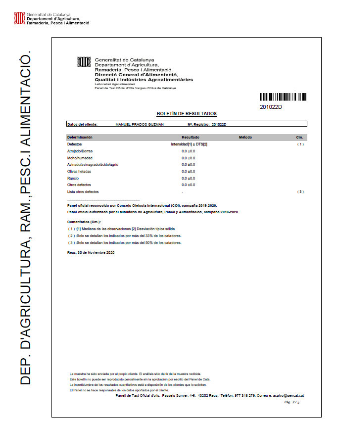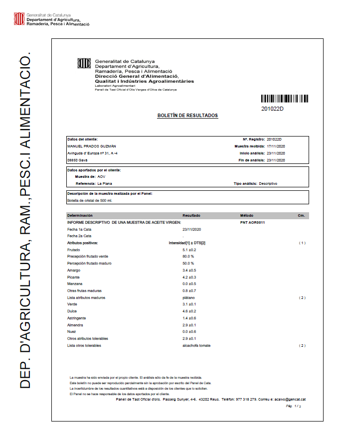 Cada año enviamos muestras de nuestro aceite para su calificación al “Panell de Tast Oficial d’Olis Verges d’Oliva del Departament d´Agricultura de la Generalitat de Catalunya” para obtener su calificación y valorar las características organolépticas, propiedades y calidad. También realizamos un análisis en laboratorio para el control de calidad y valorar su grado de acidez entre otros atributos. Como se puede apreciar en los siguientes informes oficiales, los resultados de la cosecha del 2021 determinan que el aceite es de una calidad excelente y se puede denominar Aceite de Oliva Virgen Extra.